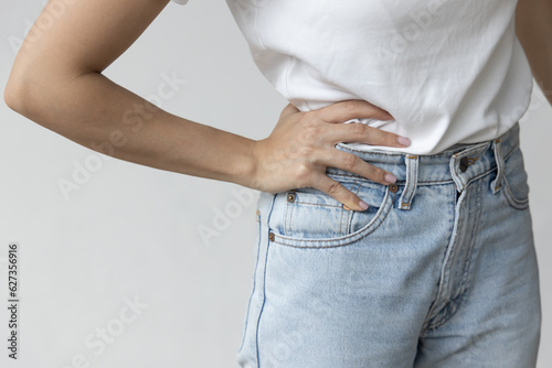 Asian woman suffering from pelvic pain, hip muscle stiffness