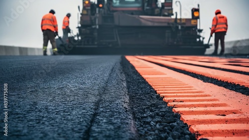 asphalt pavement with orange stripes and workers in orange vests in the background, demonstrating the road construction process and attention to detail
