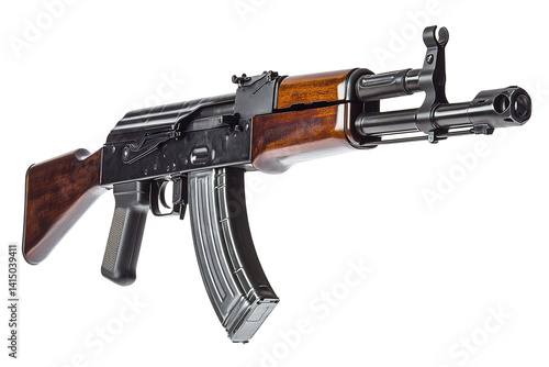 Assault rifle with wooden stock. Black receiver, barrel, sight. Magazine attached. transparent background. Side view