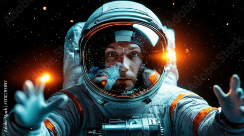 Astronaut in spacesuit reaching out in space with planets in background. Possible use Science fiction, adventure, or educational material