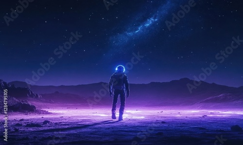 Astronaut walking across a glowing alien desert under a starry sky, distant planets faintly visible, serene and surreal sci-fi environment, ethereal tones