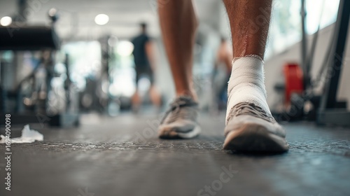 Athlete with injured ankle wrapped in medical tape during workout, sports injury treatment and recovery concept, fitness and healthcare theme.