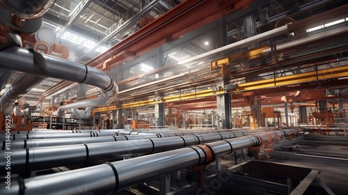 Automated cranes and machinery transporting aluminum pipes throughout a large modern industrial facility for efficient manufacturing and logistics