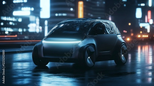 Autonomous compact urban car in futuristic cityscape nighttime gigapixel resolution minimalist design