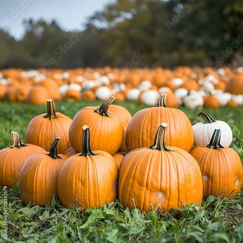 Autumn Harvest, A Pile of Orange Pumpkins in a Field