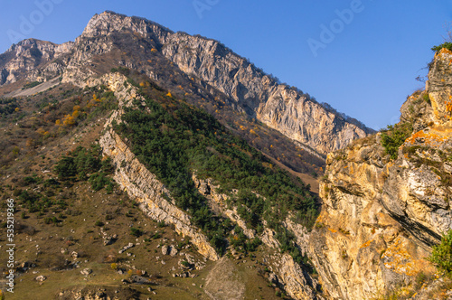 Autumn landscape in the mountains. Yellowed trees in autumn in the mountains of North Ossetia. Mountain gorges. View of the mountain peaks. Nature in the mountains.