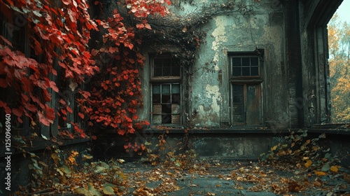 Autumnal ruin; ivy-covered walls, broken windows, fallen leaves; forest backdrop; eerie mood