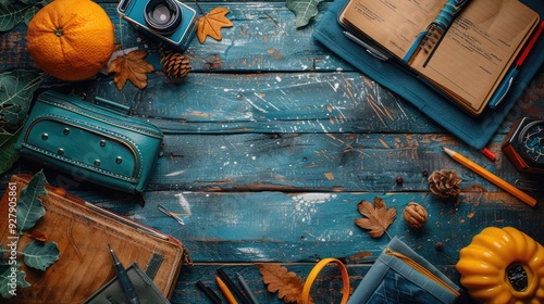 Autumnal Still Life with Blue Wood Background and Vintage Camera and Notebook