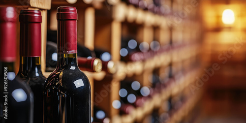 Background of a winery storage facility. Rows of Wine Bottles in a Lit Cellar