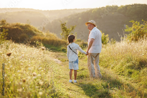 Backside photo of a little boy with his grandfather walking in a field at summer