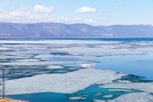 Baikal Lake in the springtime. Top view of the ice drift in the Small Sea Strait. Beautiful water landscape. Change of seasons. Natural spring background