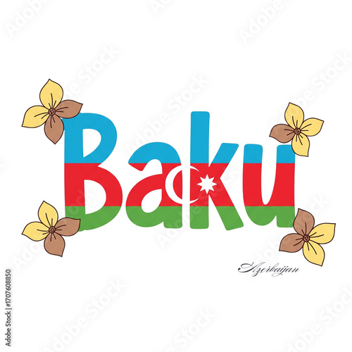 Baku" Text Filled with the Flag of Azerbaijan, Decorated with Flowers for the potential uses (sticker, t-shirt, banner), and the feeling (patriotic, travel, tourism)