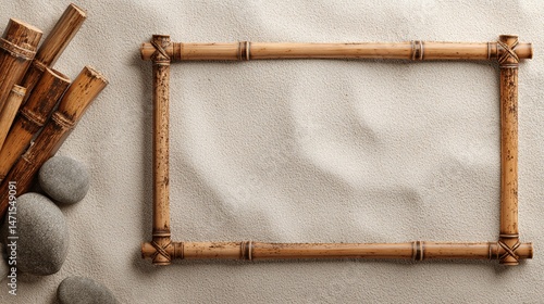 Bamboo frame with stones and bamboo sticks on a textured surface.