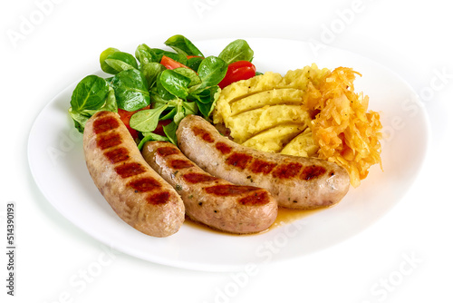 Bangers and mash, traditional british cuisine, isolated on white background.