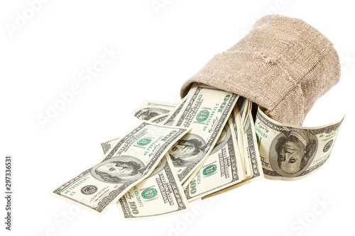 Banknotes money dollars in the bag on white background.