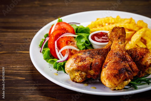 Barbecue chicken drumsticks with French fries, lettuce, tomatoes and ketchup on wooden table