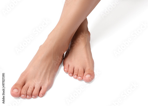 Barefoot woman on white background, closeup view