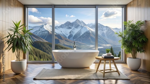 Bathroom with a view of snow-capped mountains, freestanding bathtub, small stool, decorative plant, winter, scenic view