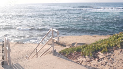 Beach access, stairs to ocean shore, La Jolla cove, California coast landscape, USA. Sea waves, cliff and green succulent ice plant. Water surface seascape, summer vacations, tourist waterfront resort