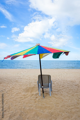 Beach chairs with colorful umbrella at the beach with blue-sky background on summer.