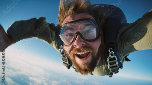Bearded man skydiving with wind in his face, capturing a thrilling moment of freefall with bright skies, safety straps, and a joyful, adrenaline-filled expression.