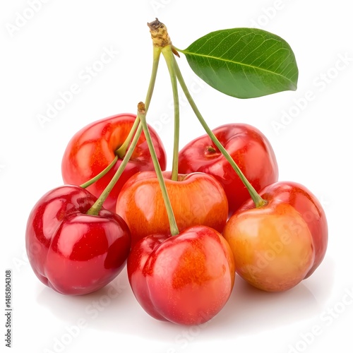 Beautiful and fresh ripe Rainier cherries with green leaf isolated on white