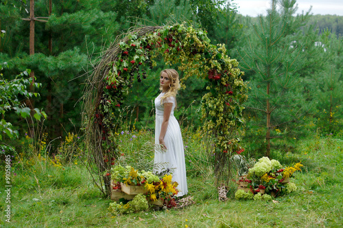 Beautiful and young girl in dress posing in the forest in the midst of a plurality of colors