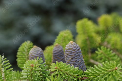 Beautiful evergreen coniferous tree.Close up Korean Fir tree cones. Korean fir-tree on a green background. Fir Abies koreana with young blue cones on branch. Silver spruce .Copy space.Winter postcard