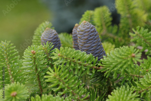 Beautiful evergreen Coniferous Tree.Close up Korean Fir tree cones. Korean fir-tree on a green background. Fir Abies koreana with young blue cones on branch. Silver spruce .Copy space.Winter postcard