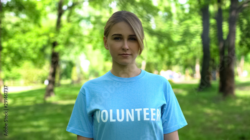 Beautiful female volunteer standing in park looking at camera, environment