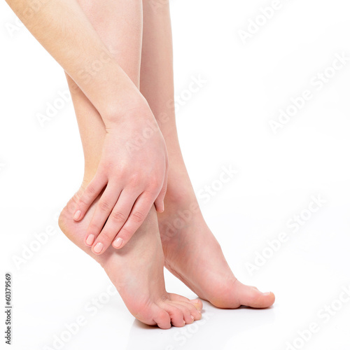 beautiful graceful female legs of young woman over white