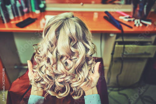 Beautiful hairstyle of young woman after dying hair and making highlights in hair salon.
