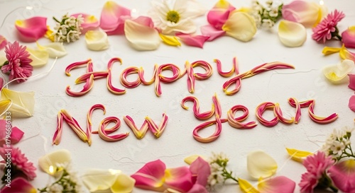Beautiful Happy New Year Decoration with Flowers and Lights