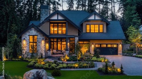 Beautiful home exterior in evening with glowing interior lights and landscaping