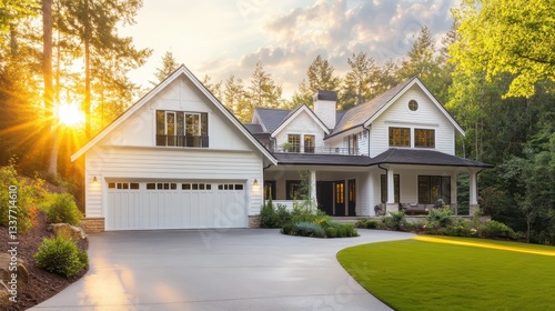 Beautiful Modern House Surrounded by Lush Greenery at Sunset