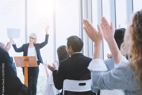 Beautiful of business woman is speaking on conference. Seminar of business model and inspiration concept.