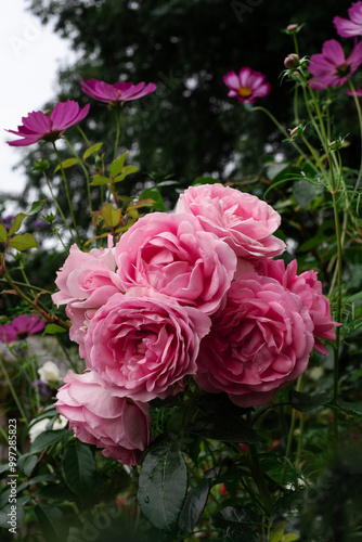 Beautiful pink roses floribunda Rosenfee Kordes in the garden