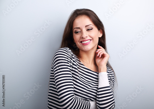 Beautiful relaxing thoughtful casual woman looking down with hap