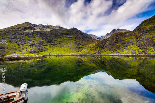 Beautiful scenic landscape of amazing Scotland nature with fishing boat.