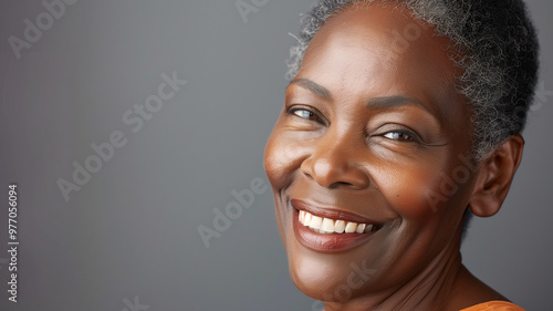 Beautiful smiling elderly african american woman, porter close-up on a gray background. Beautiful old age, golden years. A concept for a beauty salon, clinic.