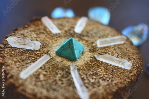 Beautiful, sparkling healing crystals. Witchy crystal grid, wiccan alter set up. Healing energy, shot in natural lighting with low exposure. Crystal Grid, sacred space. Bohemian decorations, romantic