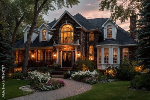 Beautiful stone house with glowing lights and landscaped yard in a residential neighborhood at dusk, winding brick pathway leading to the grand entrance
