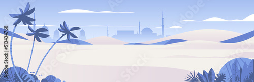 Beautiful summer desert with palms muslim cityscape horizontal