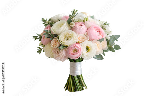 Beautiful wedding bouquet of roses and peonies isolated on white background