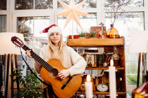 Beautiful young blonde woman in a funny red beanie Santa Claus plays the guitar.