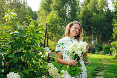 beautiful young woman gardener posing with hydrangea flowers in summer cottage garden