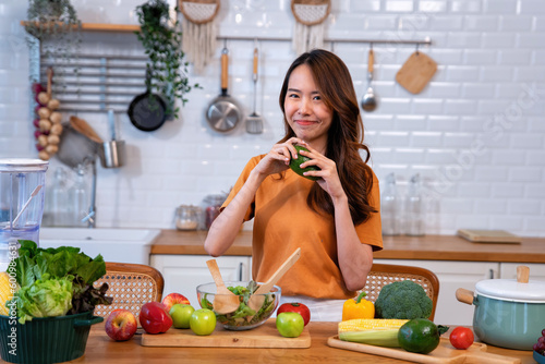 Beautiful young woman happy portrait cooking fresh organic clean food fruit at home modern kitchen