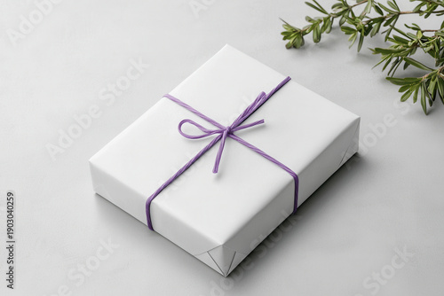 Beautifully wrapped gift box with purple ribbon, surrounded by greenery, evokes sense of celebration and joy