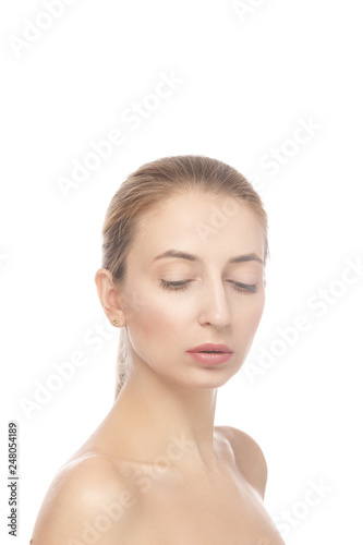 Beauty. Woman face. Portrait. Beautiful model. Blonde female on a white background with eyes closed. Youth and Skin Care Concept. Isolated on a white background