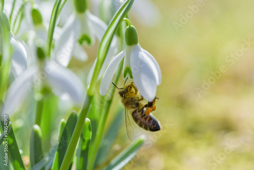 Bee in snowdrop. Early spring close-up flowers and working honeybee.